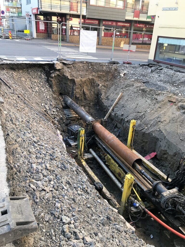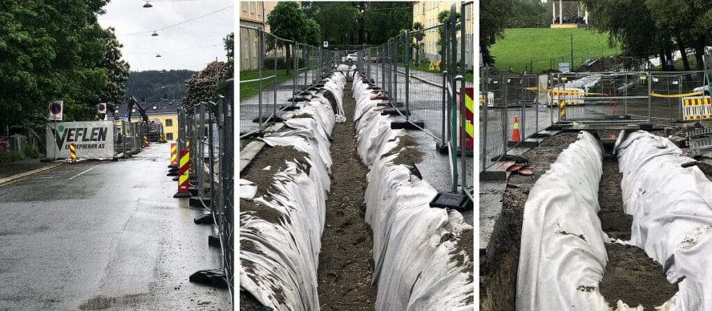 Det har vært mellom 6-8 gravemaskiner og 8-15 lastebiler i sving på prosjektet gjennom hele perioden. I tillegg har vi også hatt 1-2 hjelpemannskaper med oss hele tiden. Alle har gjort en kjempeinnsats.   At vi kan grøfting i trange og utfordrende traseer er denne jobben nok et eksempel på. Selv med utfordringer som «spagetti av kabler», hardt fjell i grøftetrasé, andre ulike hindringer av eksisterende infrastruktur, samt graving i nærhet av 3 barnehager har vi ingen forsinkelser.