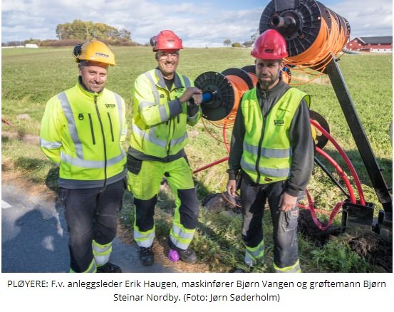Det er Brunbjørn AS som er hovedentreprenør og oppdragsgiver når vi her pløyer ned trekkerør til fiber for Eidsiva Bredbånd. Metoden med å pløye ned rørene er mye brukt i Sverige, men mer uvanlig i Norge, sier prosjektleder Kjetil Hansen. Vi i Veflen Entreprenør AS er godt kjent med denne måten å legge trekkerør på da vi selv brukte plogmetoden for 20-30 år siden.